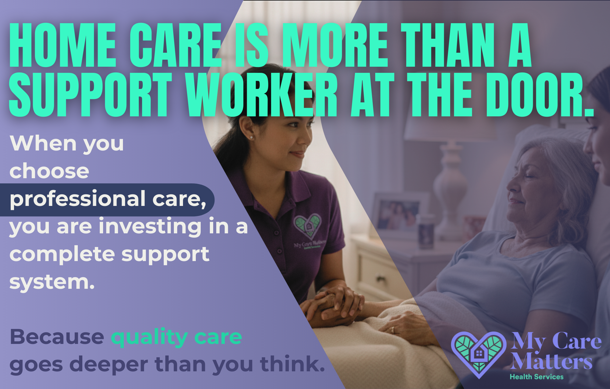 My Care Matters is highly committed to delivering compassionate, professional support tailored to meet the unique needs of each client. Our dedicated team ensures comfort, safety, and well-being, allowing individuals to receive the best care in the familiar surroundings of their own home.
